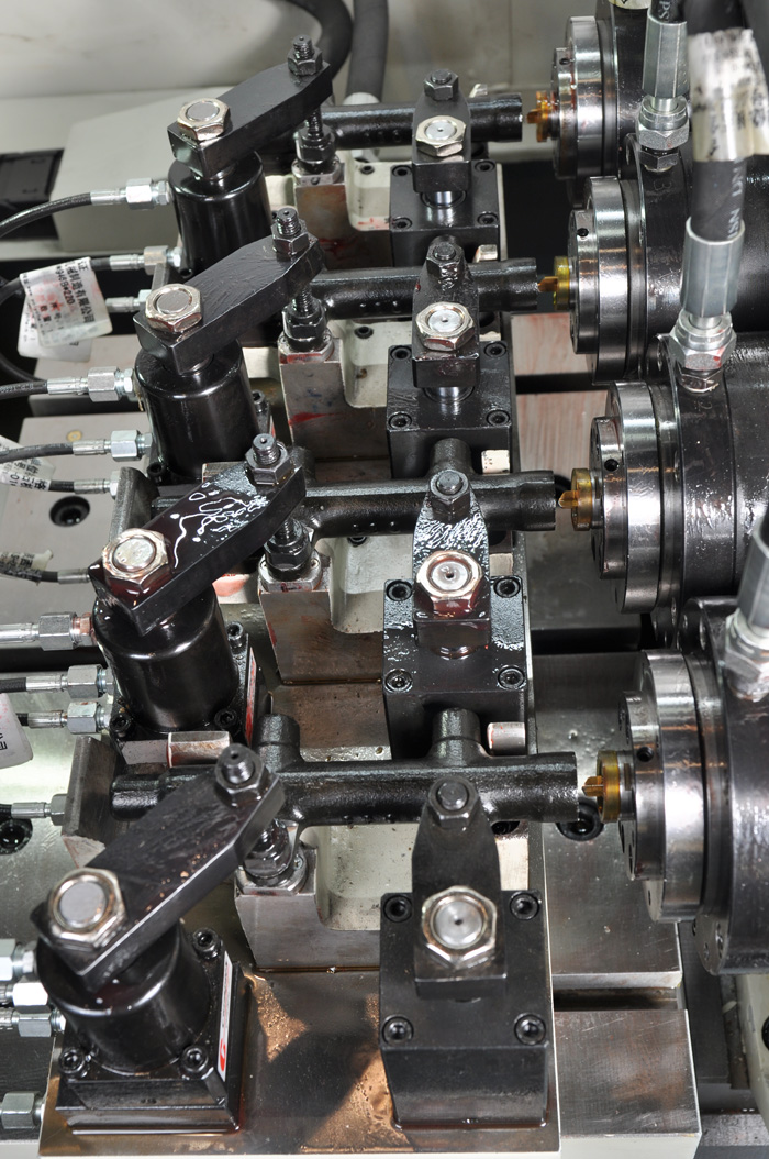 導(dǎo)向套:液壓驅(qū)動(dòng),四個(gè)工位可單獨(dú)頂出,貼緊工件端面;