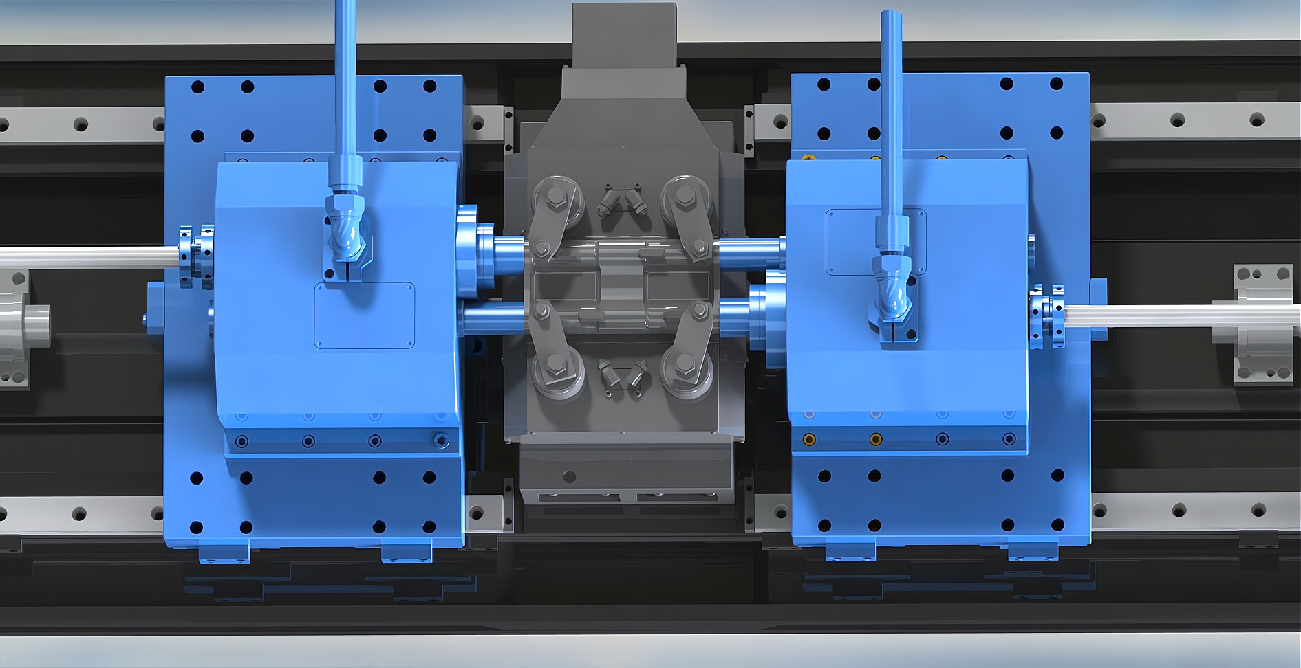 簡(jiǎn)要說(shuō)明:機(jī)床采用臥式布局,兩支鉆桿對(duì)向錯(cuò)位設(shè)計(jì),中心距94mm(可定制),刀具采用BTA單管鉆。工裝放置在機(jī)床的中間位置,液壓旋轉(zhuǎn)壓板自動(dòng)夾緊。一次裝夾,可同時(shí)對(duì)向鉆削加工完成履帶板上的2-φ32mm深孔。加工效率極高。冷卻系統(tǒng)放置在主機(jī)后面,平行放置,結(jié)構(gòu)緊湊,占地面積??;