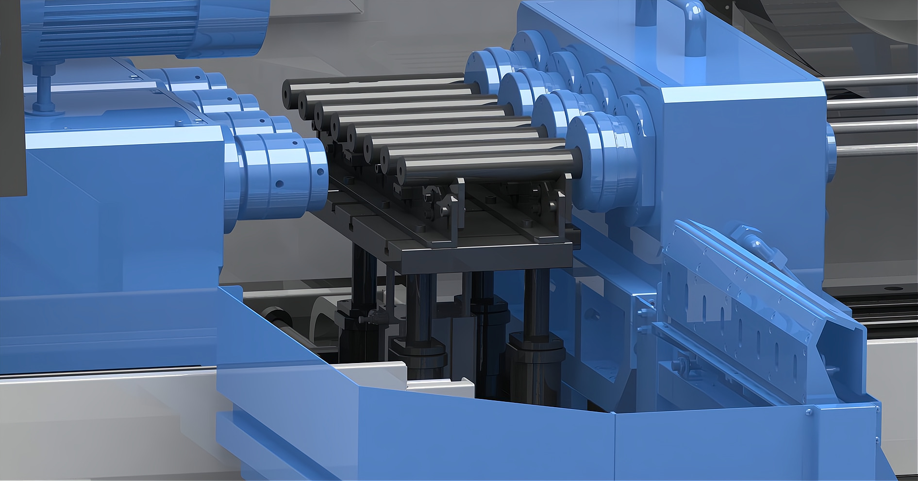 臥式結(jié)構(gòu)含升降+橫向移動送料結(jié)構(gòu),實現(xiàn)機內(nèi)深孔加工和機外裝卸工件同時進行,機床裝卸工件不停機,大大提高了機床工作效率