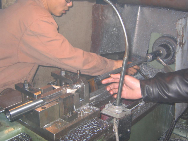 2、根據(jù)實際情況設(shè)計工裝,將工件固定在機床中托板上。并可以設(shè)計導(dǎo)向套安裝在工件前端面,引導(dǎo)深孔鉆進入。此種方法不需在深孔加工前加工引導(dǎo)孔。大大提高了加工效率。改造深孔鉆鏜床刀具的安裝可根據(jù)工件的實際情況選擇方式:機床轉(zhuǎn)速和最小進給量都能滿足加工要求時,旋轉(zhuǎn)夾具錐柄直接安裝在機床主軸錐孔內(nèi),刀具安裝在旋轉(zhuǎn)夾具,機床主軸通過旋轉(zhuǎn)夾具帶動刀具作旋轉(zhuǎn)運動,進給運動由大托板提供。