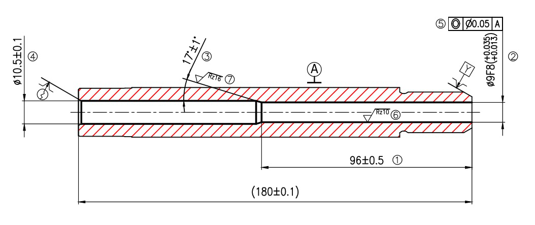 1. φ9F8 (+0.013-0.035),該孔的加工難點(diǎn)在于孔徑公差、孔壁粗糙度和偏斜度的控制。