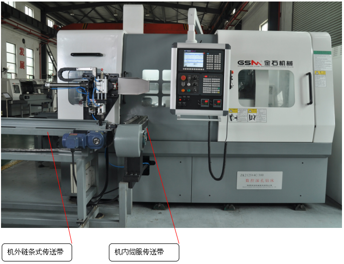 毛坯工件依靠機外鏈條式傳輸帶輸送到機床正前方;